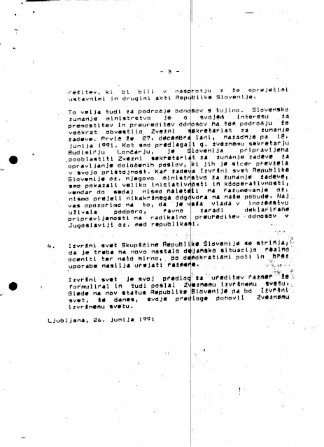 Izvršni svet Republike Slovenije je 26. junija 1991 objavil stališče o razglasitvi samostojne in suverene države. V dokumentu je bilo poudarjeno zagotavljanje prostega prehajanja meje in izpolnjevanje sprejetih mednarodnih obveznosti ter izpostavljeno, da na slovenski strani ne bo z nobenim dejanjem uporabljena ali izzvana uporaba sile. Zveznim organom je izvršni svet predlagal reševanje nastale situacije po mirni in demokratični poti, brez uporabe nasilja.